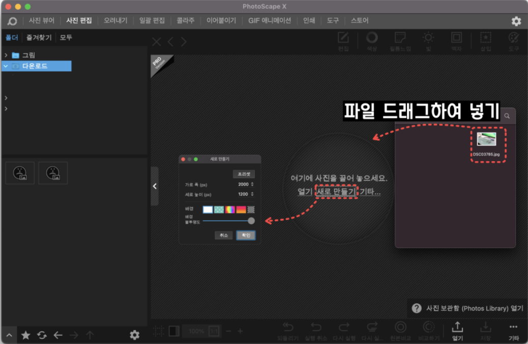 위의 링크에서 다운로드 받은 후 프로그램을 실행하셨다면 아래와 같은 화면이 뜹니다. 아래 사진과 같이 편집할 이미지를 드래그해서 넣으면 됩니다. 또, 배경을 만들고 싶으실 수 있습니다. 이때는 이미지 파일을 넣어 편집하고 싶다면 새로 만들기를 누르시면 됩니다.
